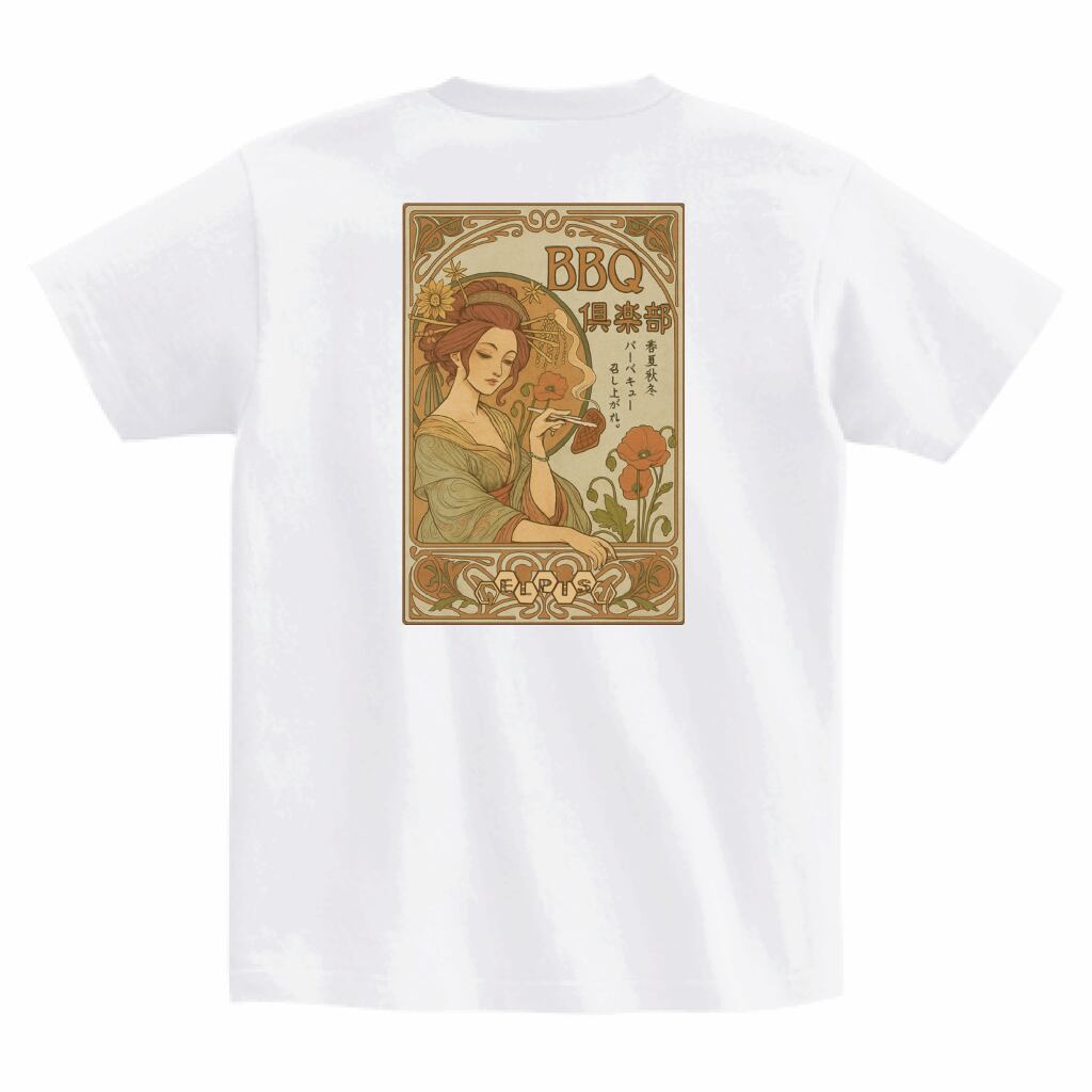 美しくもどこかユーモラスな「BBQ倶楽部」メンバーを描いた、アール・ヌーヴォー調のイラストTシャツです。