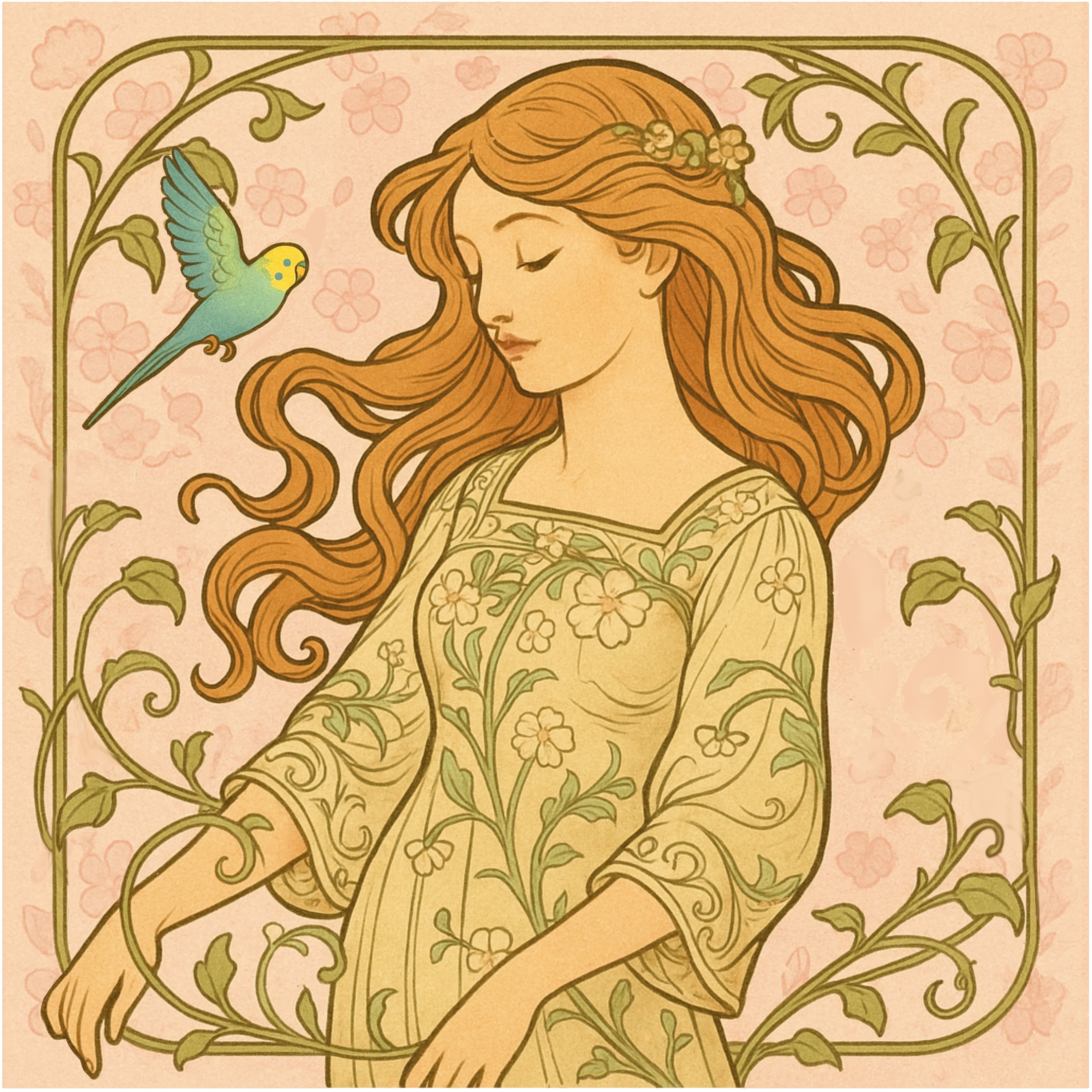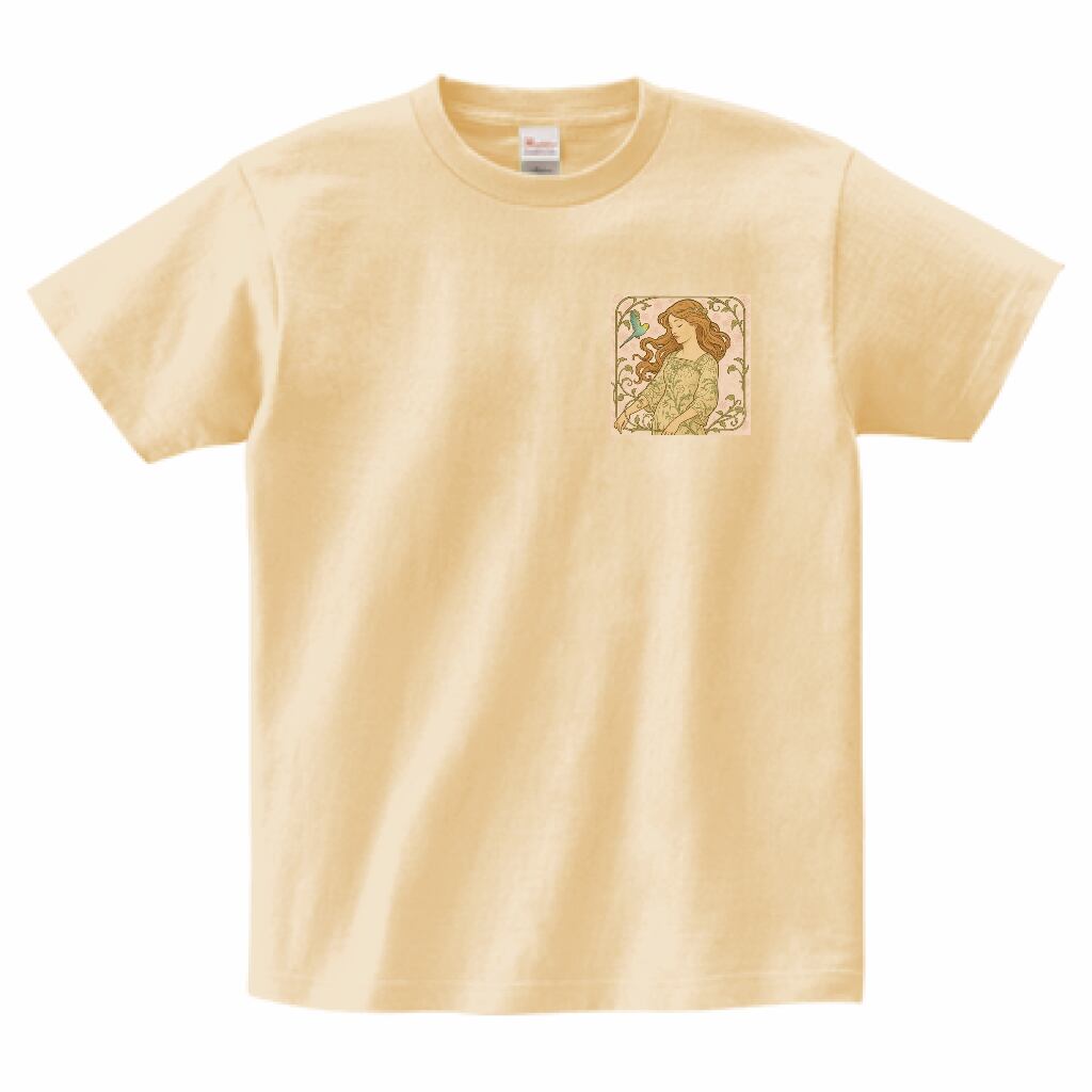 「さえずり クラシックTシャツ」は、愛らしいインコのラムネと精霊(美人画少女)が戯れる、フラスコ画風のタッチが魅力的な一枚です。目を閉じ、軽く微笑む姿が、なぜか母性を感じさせ、見る人の心を癒します。