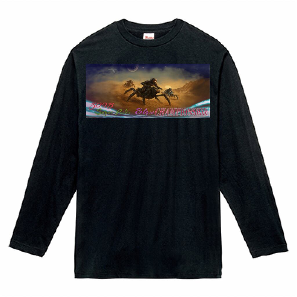 昆虫のような脚で疾走するSFバイクが描かれた、競技の興奮が詰まったアートTシャツです。胸には銀河のさまざまなステージを舞台にしたレースのシーンをシネマサイズで切り取ったプリントが施されており、視線を引き付けます。首元にはレーシングチームのロゴがあしらわれ、スタイリッシュな印象を与えます。