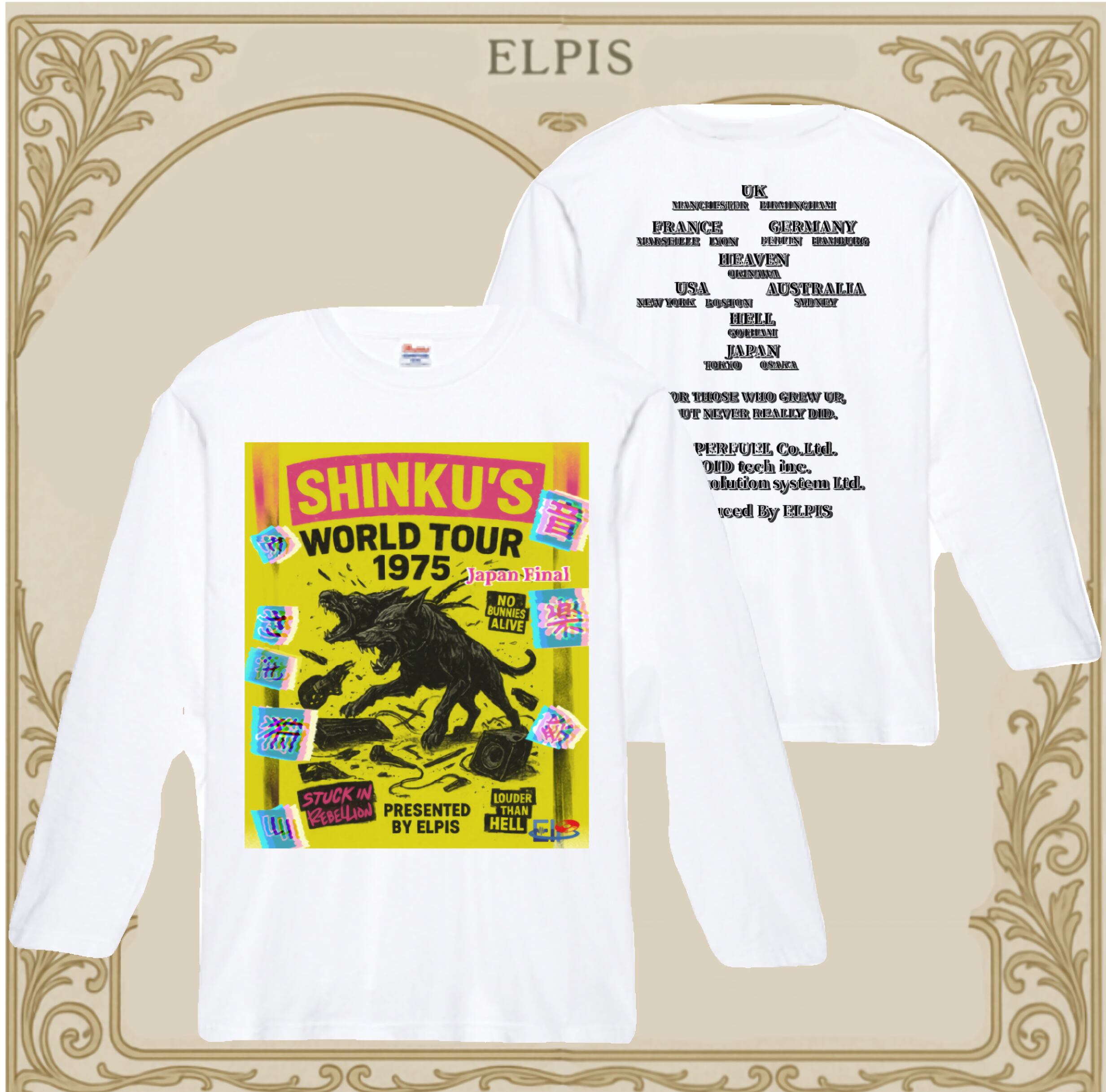 前面グラフィックは、WORLD TOUR × PUNKカルチャー を掛け合わせたELPISオリジナル。