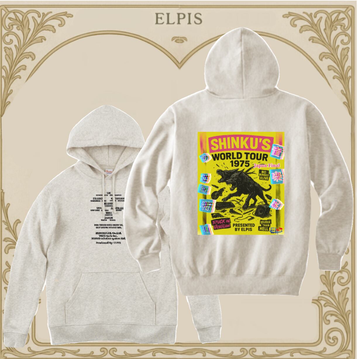 フロントはシンプルに、背面にツアーTシャツ風グラフィックを配置。